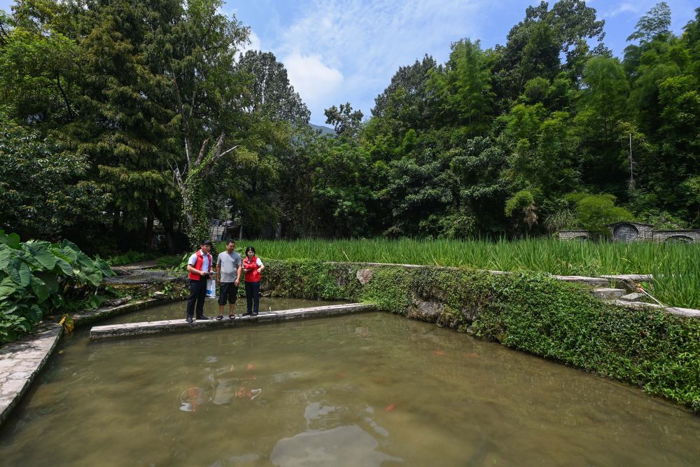 2023年8月17日,浙江省丽水市青田县方山乡田鱼养殖户吴勇强(中)在接受青田农商银行“小蜻蜓”服务队志愿者提供的“惠民易贷”上门服务。近年来,青田县金融发展中心联合各个金融机构优化配套乡村振兴金融服务,推出“惠民易贷”“农家乐贷”等金融产品,重点支持涉农龙头企业及特色种养殖产业。新华社记者 徐昱 摄