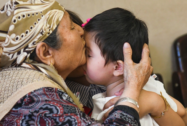 在位于新疆青河县的家中,阿尼帕在亲吻家人(2022年7月10日摄)。