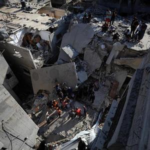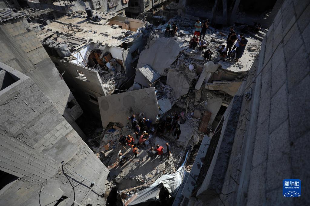 11月1日,在加沙地带南部城市汗尤尼斯,人们在遭以色列袭击后的建筑废墟进行搜救工作。