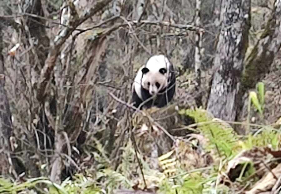 工作人员与野生大熊猫偶遇时用手机拍摄的照片。(大熊猫国家公园白水江分局供图)