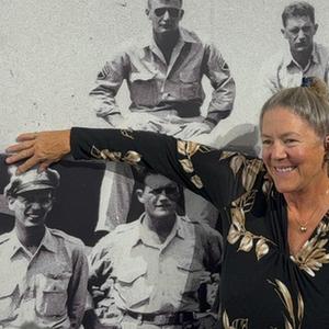 11月1日下午,在重庆史迪威博物馆展厅,罗宾·奥尔尼一眼就在照片墙上认出父亲理查德·奥尔尼。看到父亲年轻时的样子,她神情激动,眼角泛起泪花,忍不住用脸贴近照片,不时亲吻照片里的父亲……