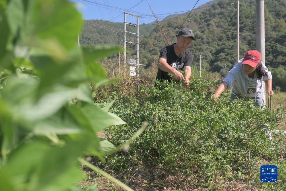 11月1日,李飞(左)和王霖娜在自家菜园采摘红辣椒。