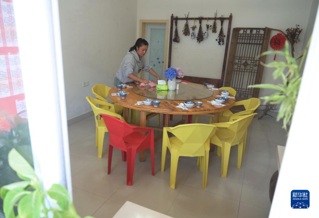 11月1日,王霖娜在她经营的“农家乐”里整理餐桌。
