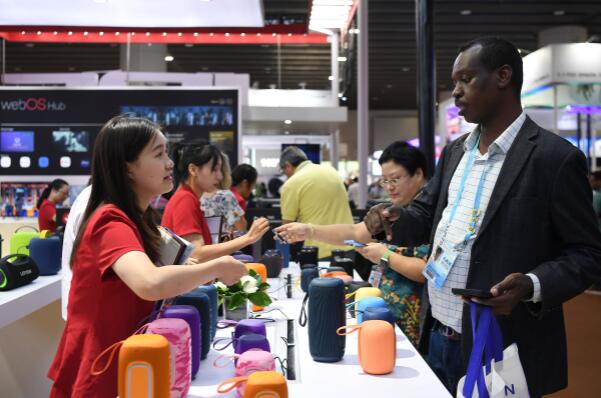 在第134届广交会上,来自苏丹的采购商在智能音箱展台洽谈。新华社记者 邓华 摄