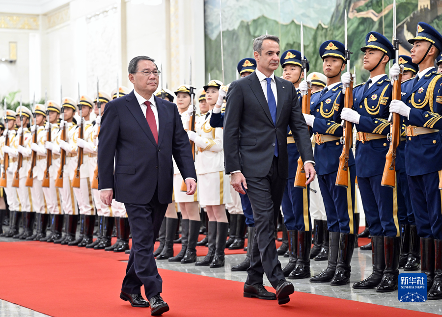 11月3日上午,国务院总理李强在北京人民大会堂同来华进行正式访问的希腊总理米佐塔基斯举行会谈。这是会谈前,李强在人民大会堂北大厅为米佐塔基斯举行欢迎仪式。新华社记者 殷博古 摄