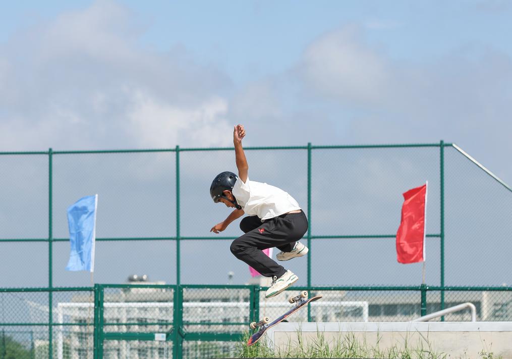 11月4日,武汉市选手詹何在第一届全国学生(青年)运动会滑板男子街式决赛中夺冠。新华社记者 胡星宇 摄