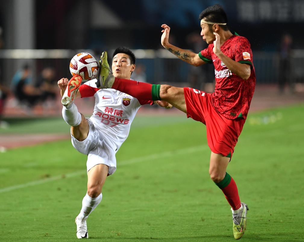 8月25日,上海海港队球员武磊(左)与河南队球员顾操在比赛中拼抢。新华社记者 李嘉南 摄