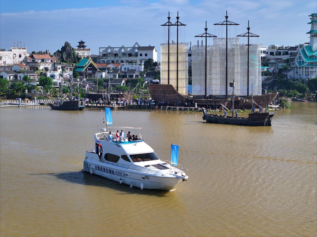 10月23日,火炬手劳义在乘船传递火炬(无人机照片)。新华社记者 周华 摄