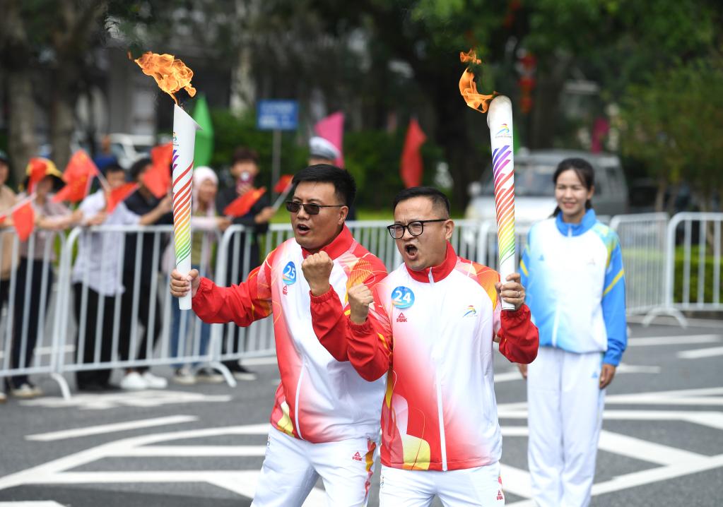 10月23日,火炬手宣首(左)和许振在火炬传递活动中。新华社记者 周华 摄