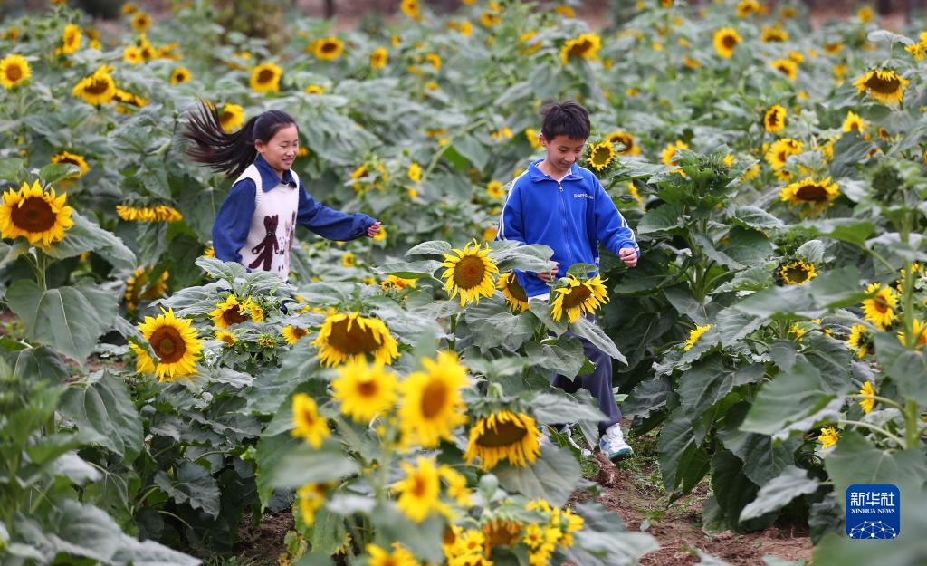 11月4日,孩子们在山东省滕州市张汪镇一片向日葵花田里玩耍。