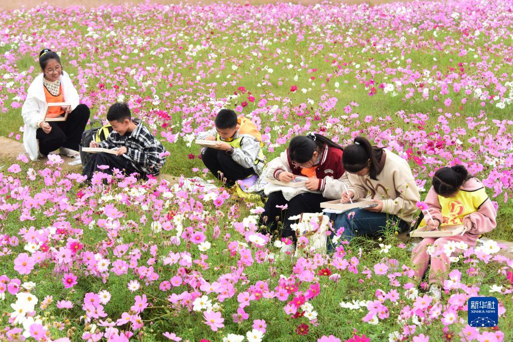 11月4日,在湖南省常德市澧县城头山国家考古遗址公园,学生在花海里写生。