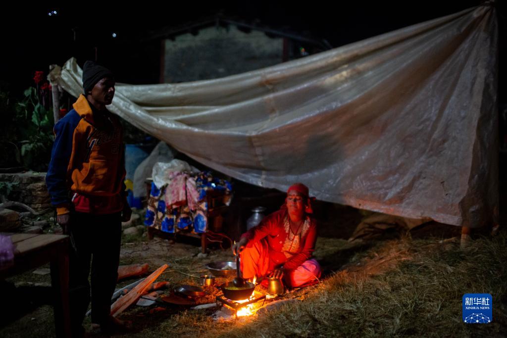 11月5日,一名女子在尼泊尔西部扎泽尔果德地震灾区的应急帐篷外做饭。