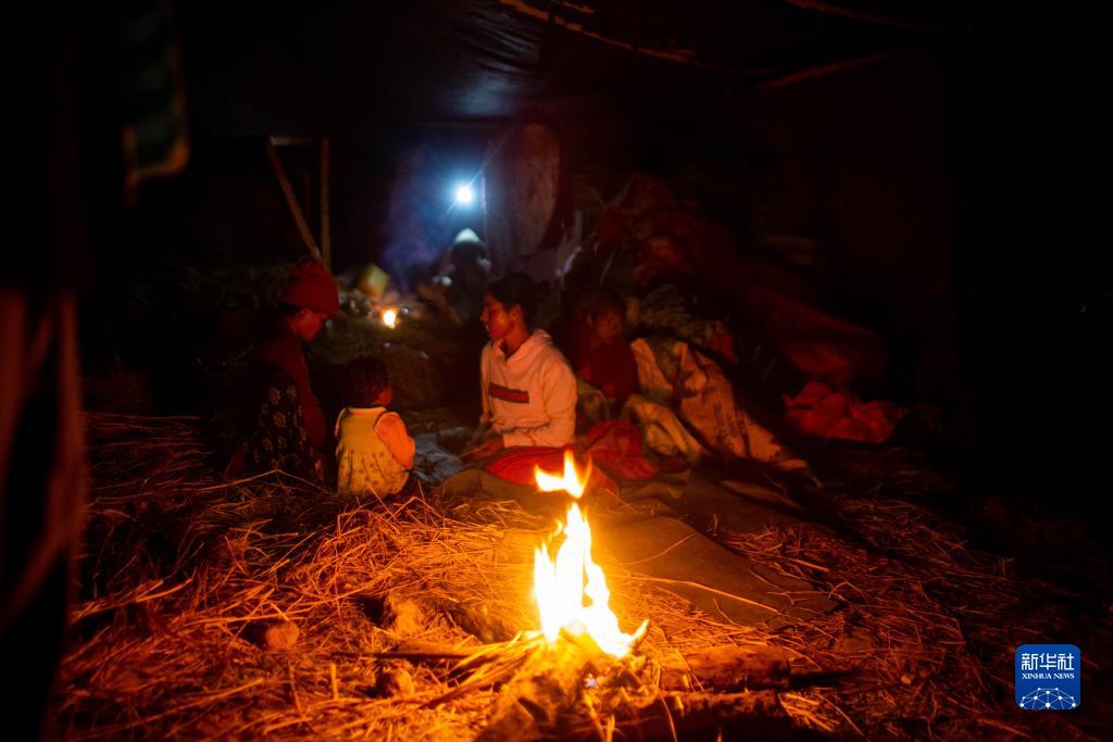 11月5日,人们在尼泊尔西部扎泽尔果德地震灾区的火堆旁取暖。