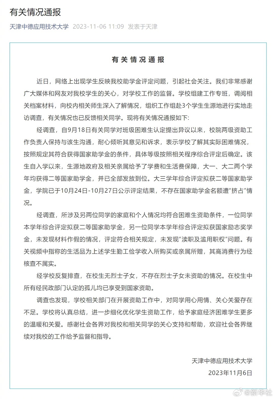 近日,天津中德应用技术大学学生反映助学金评定问题的视频,引发网民关注。6日,天津中德应用技术大学发布了有关情况通报,全文如下