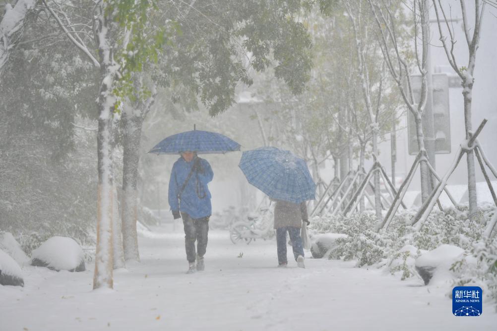 11月6日,在沈阳市浑南区,行人在雪中行走。