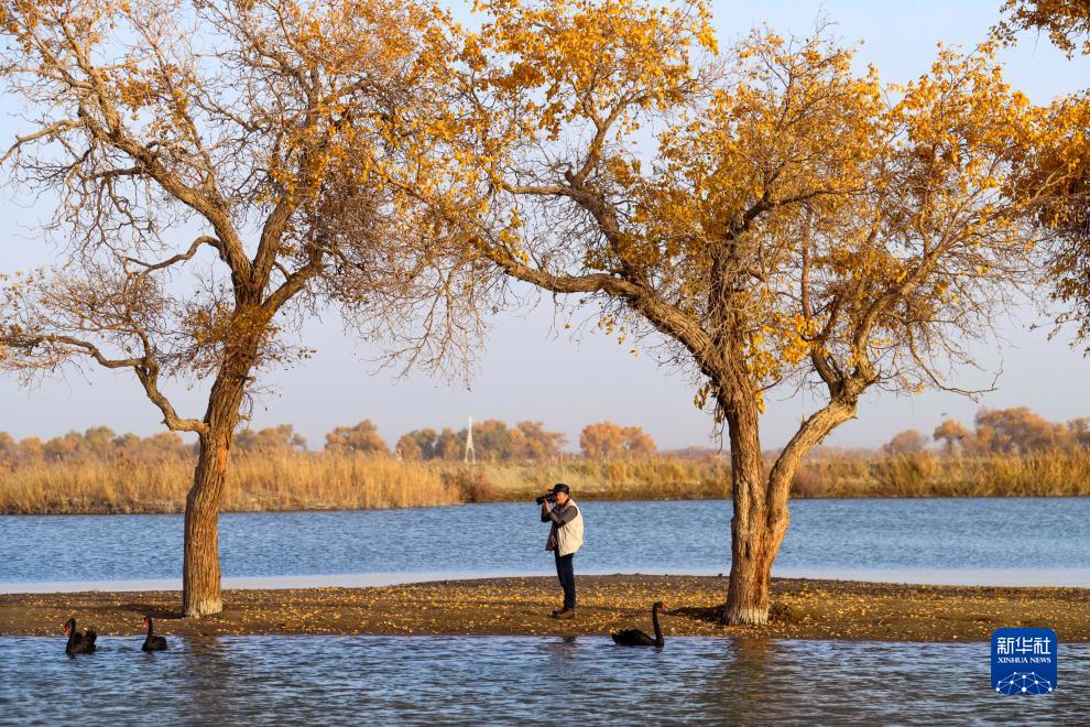 在新疆尉犁县罗布人村寨景区,一名摄影爱好者在拍摄美景(11月3日摄)。