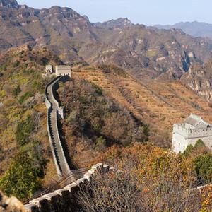 位于天津市蓟州区北部山区的黄崖关长城被秋叶点缀,美景如画。