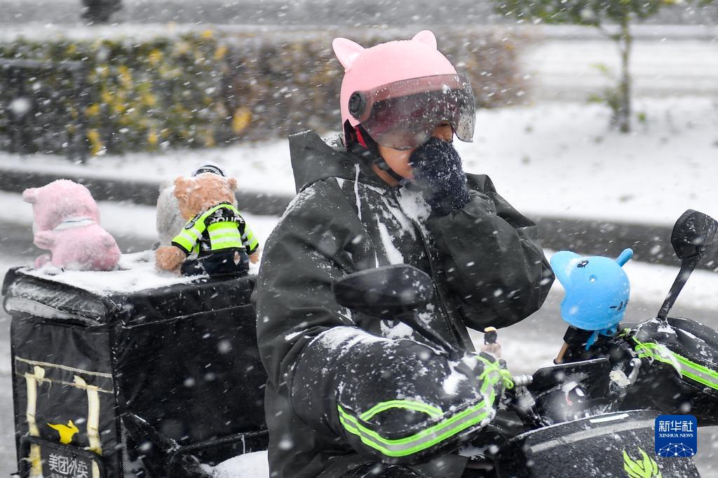 11月6日,在长春市街头,一名外卖员在雪中骑行。