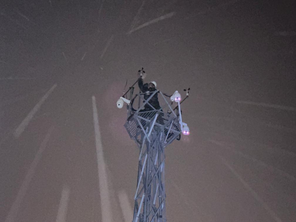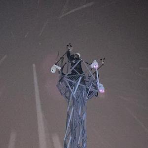 11月5日夜间,库伦旗气象部门工作人员冒着风雪爬上风塔,排除风速传感器故障。(受访者供图)