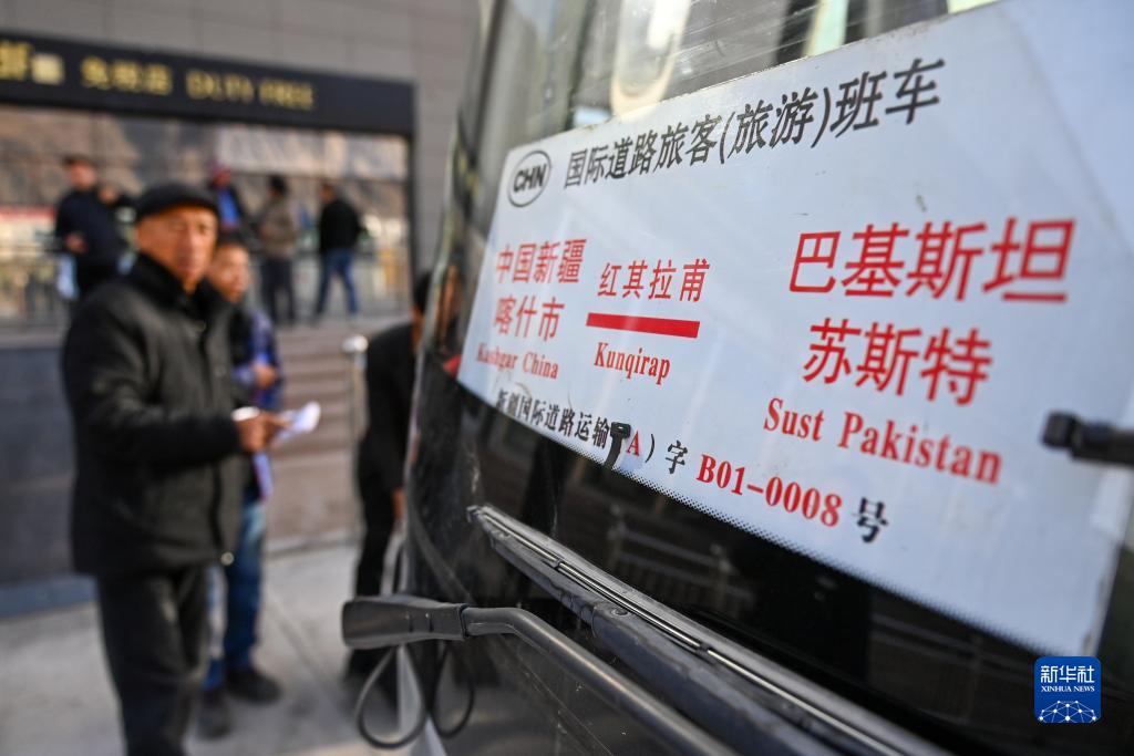 在新疆红其拉甫口岸,出境旅客排队登上国际道路旅客班车(11月6日摄)。