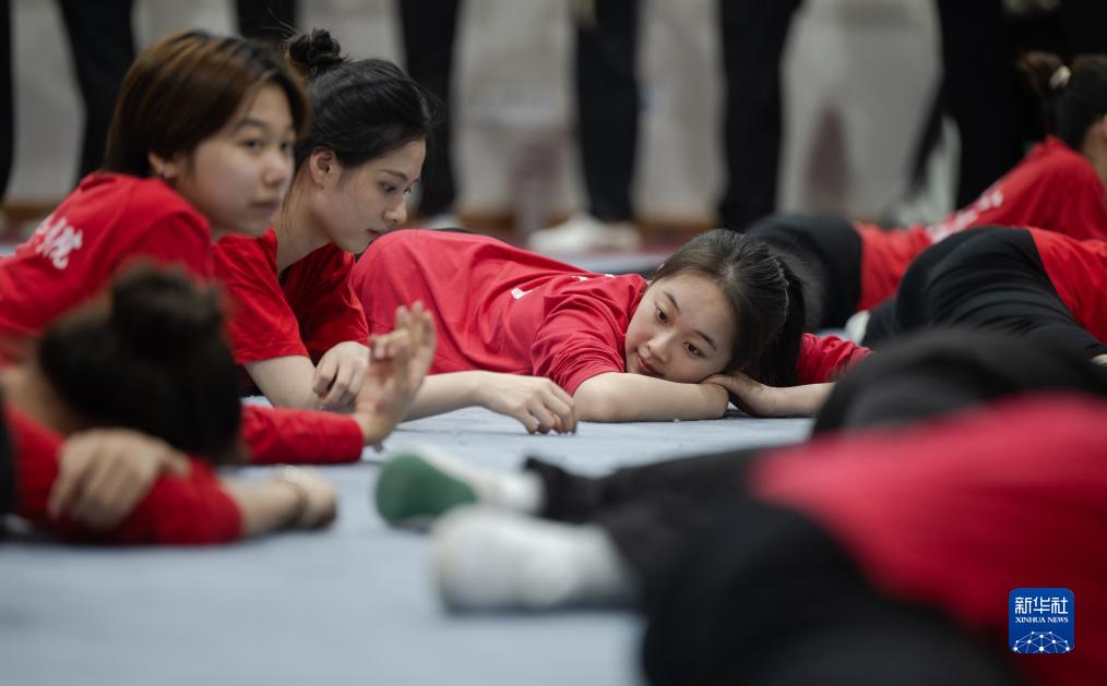 10月30日,汉剧演员邹雨含(右)、邓文婷(中)、戴欣苡在练功。