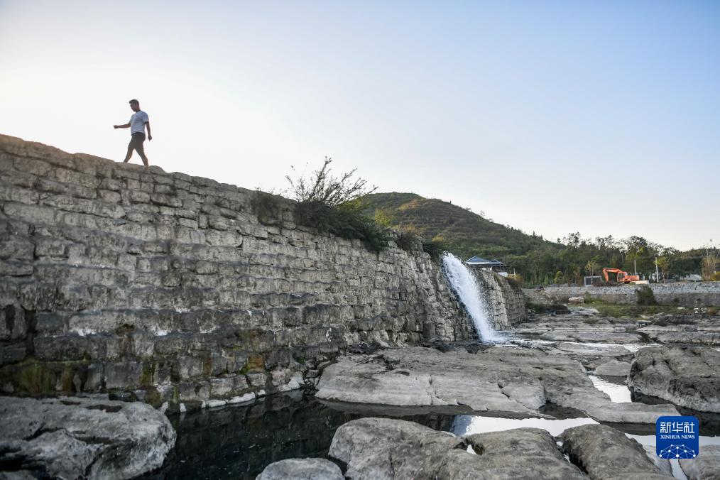 11月6日,村民行走在白霓古堰上。