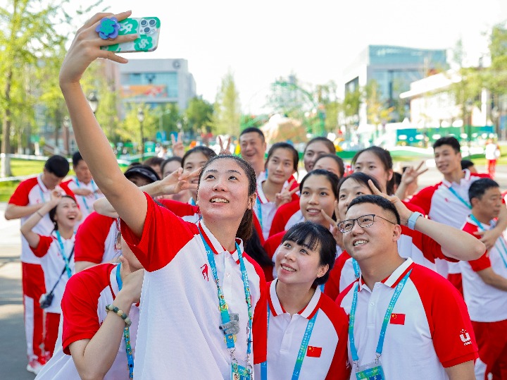 2023年7月28日,中国女排姑娘们与队伍管理人员张玉龙(前右一)一起自拍。当晚,第31届世界大学生夏季运动会在成都东安湖体育公园主体育场开幕。