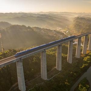 2023年8月31日,一列动车组在晨曦中经过位于贵州省独山县郊外的贵南高铁银坡河特大桥(无人机照片)。继新建贵阳至南宁高速铁路贵阳至荔波段2023年8月8日开通运营后,南宁至荔波段于2023年8月31日开通运营。至此,贵南高铁实现全线贯通运营。
