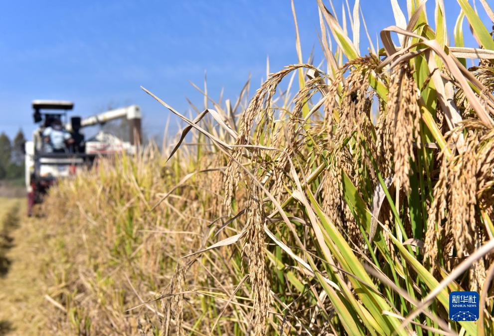 11月8日,在安徽省巢湖市中垾镇庆树家庭农场,农机手驾驶收割机在田间收割水稻。