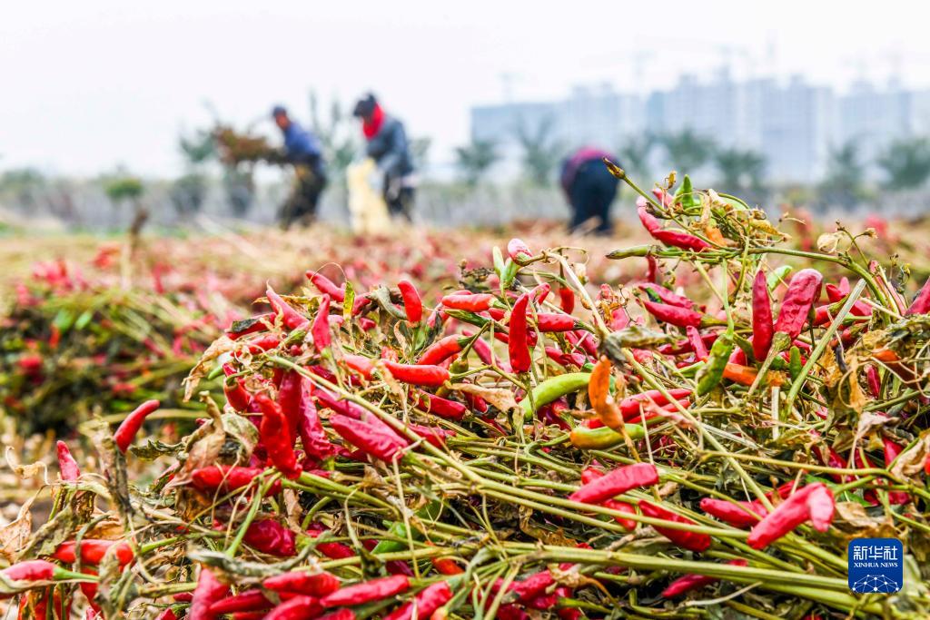 11月8日,农民在河北省遵化市一家蔬菜专业合作社种植基地收获辣椒。