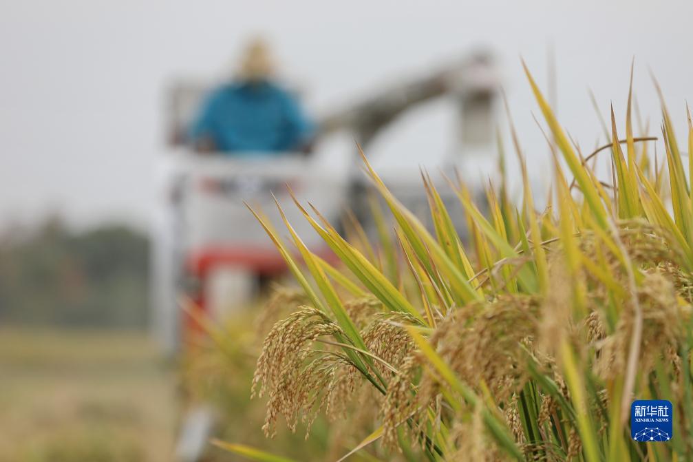 11月8日,在浙江省嘉兴市南湖区余新镇,农机手驾驶收割机在稻田间劳作。