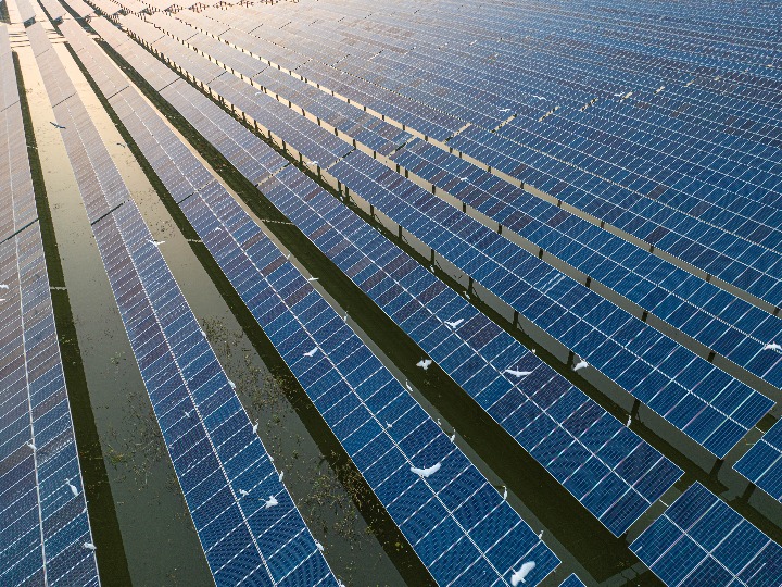 马鞍山市当涂县大陇镇双潭湖“渔光互补”光伏电站内白鹭纷飞。(王强 摄)