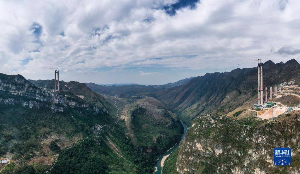 这是11月8日拍摄的贵州六安高速花江峡谷大桥建设现场(无人机全景照片)。