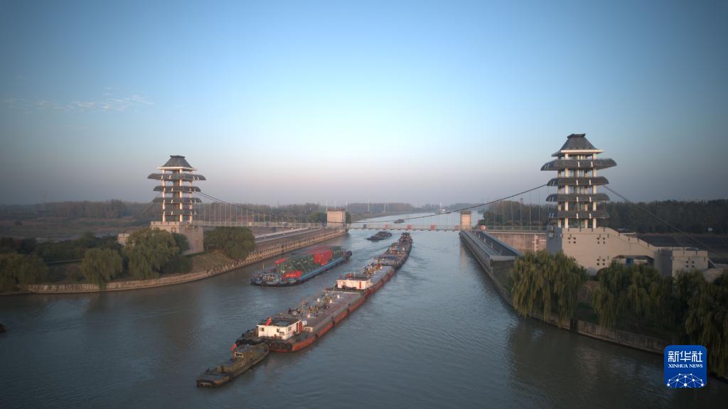 船只行驶在京杭大运河上(无人机照片,2023年10月29日)。新华社记者 刘诗平 摄