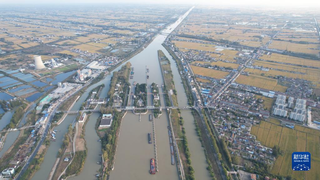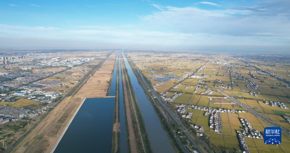 南北向的京杭大运河分别与东西向的苏北灌溉总渠(上)和淮河入海水道(下)交汇(无人机照片,2023年10月29日)。新华社记者 刘诗平 摄