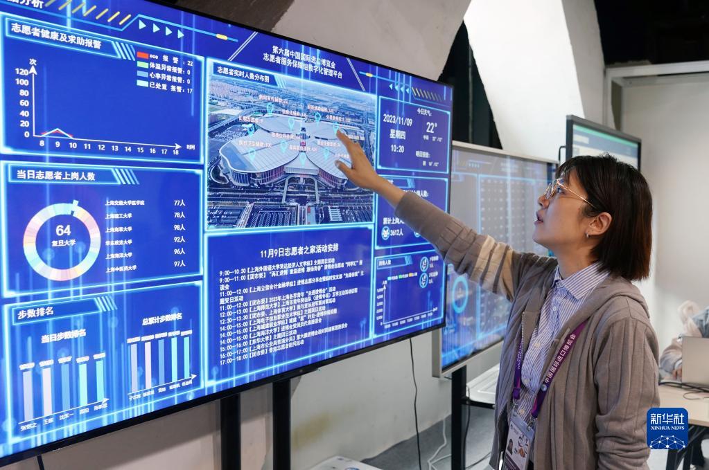 11月9日,工作人员在介绍第六届进博会志愿者服务保障组数字化管理平台。该平台依托智能手环,通过动态监测和可视化显示,对志愿者进行数字化管理,为志愿者提供精心保障。