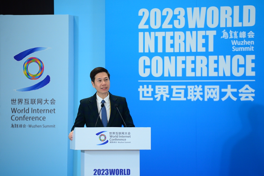 2023年世界互联网大会乌镇峰会数字素养与技能提升论坛11月9日下午在浙江乌镇举行。图为全国政协委员、香港特区立法会议员吴杰庄作主旨演讲。(新华网 陈竞超 摄)