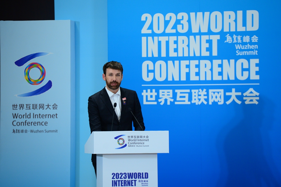 2023年世界互联网大会乌镇峰会数字素养与技能提升论坛11月9日下午在浙江乌镇举行。图为新西兰籍网络名人安柏然作主旨演讲。(新华网 陈竞超 摄)