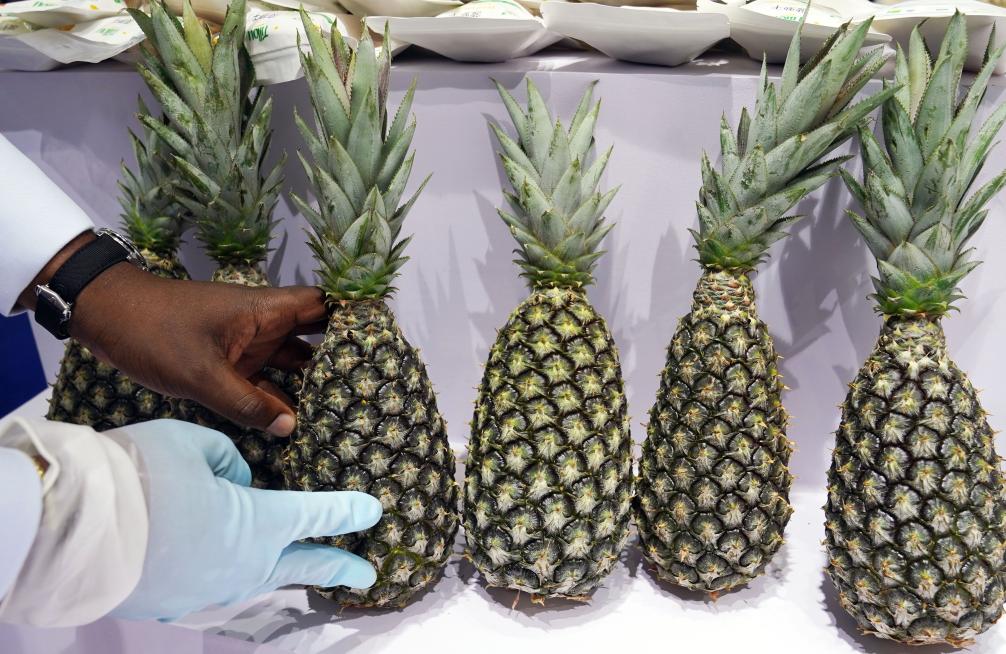 2023年11月5日在第六届进博会食品及农产品展区拍摄的首次亮相中国的贝宁菠萝。(新华社记者 刘颖 摄)