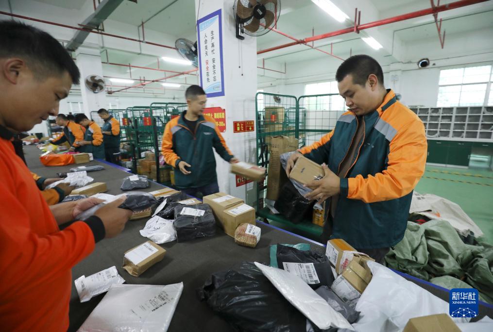 11月10日,在中国邮政集团有限公司湖南省资兴市分公司邮件处理中心,工作人员在分拣包裹。