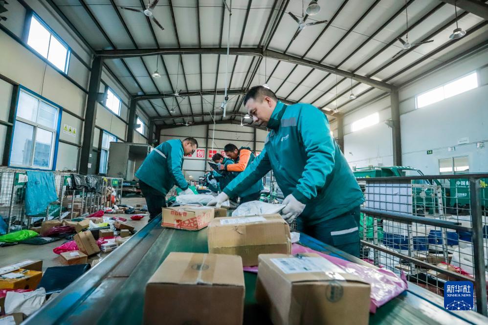 11月9日,河北省遵化市邮政快递公司的工作人员在车间分拣收寄的快件。
