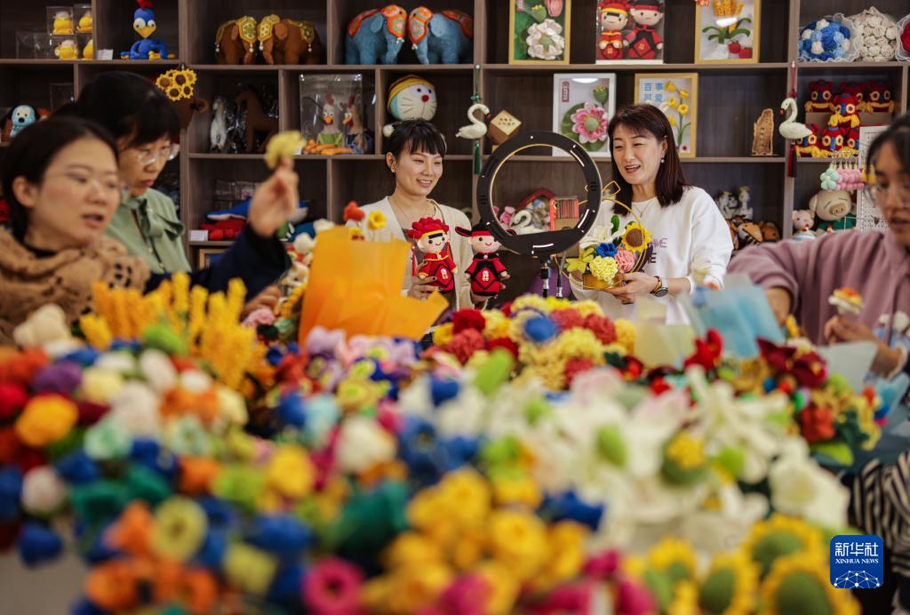 11月9日,山东省荣成市巾帼创业孵化基地,妇女创客在包装毛线编织手办、花束订单。