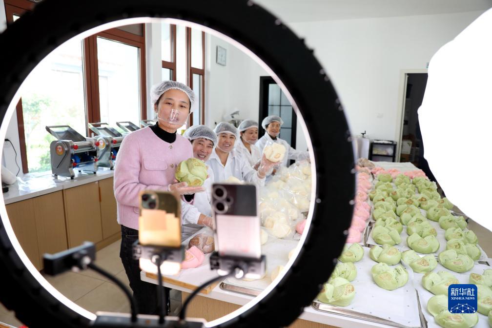 11月8日,山东省青岛西海岸新区海青镇共富电商直播基地,志愿者在直播售卖海青花馍。