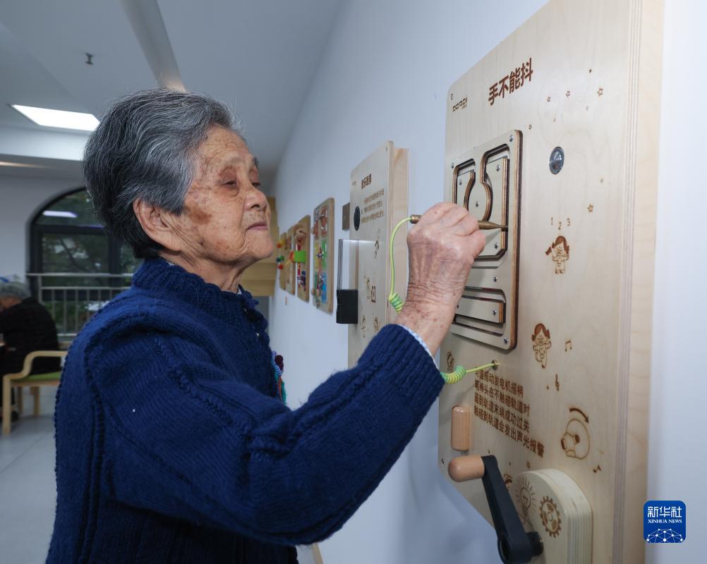 11月10日,在云和县百龄帮凤凰家园长者养护中心的老年木玩活动室内,一名91岁的老人在玩益智木玩。