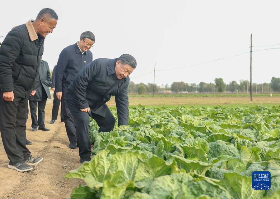 11月10日,中共中央总书记、国家主席、中央军委主席习近平在北京、河北考察灾后恢复重建工作。这是10日下午,习近平在河北保定涿州市刁窝镇万全庄村村边农田察看大白菜长势。新华社发(盛佳鹏摄)