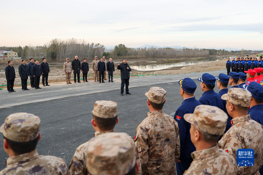 11月10日,中共中央总书记、国家主席、中央军委主席习近平在北京、河北考察灾后恢复重建工作。这是10日下午,习近平在河北保定涿州市白沟河治理工程(涿州段)考察时,同水利工程建设人员和曾经参加涿州抗洪救援的解放军和武警部队官兵、民兵预备役人员、消防救援队伍等方面的代表亲切交流。新华社发(盛佳鹏摄)