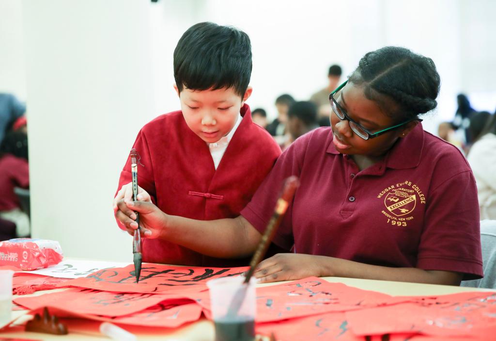 2018年2月2日,在美国纽约举行的文化交流活动上,来自北京的小学生教纽约梅德加·埃弗斯学院预备学校的学生练习中国书法。新华社记者王迎摄