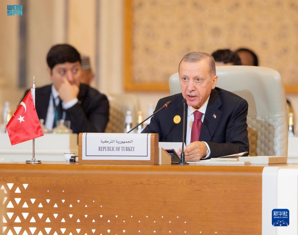 11月11日,在沙特阿拉伯首都利雅得,土耳其总统埃尔多安出席阿拉伯-伊斯兰国家领导人联合特别峰会。新华社发(沙特通讯社供图)