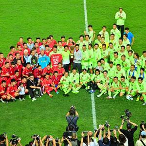 11月11日,贵州榕江“村超”联队与香港明星足球队在比赛后合影。新华社记者 朱炜 摄