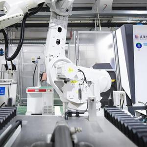 在浙江宁波江丰电子材料股份有限公司分析检测中心,工业机器人在自动化产线加工芯片靶材(2023年3月21日摄)。新华社记者 翁忻旸 摄